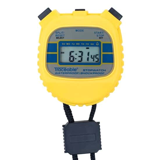 This water- and shock-resistant stopwatch offers excellent durability and ease-of-use for use anywhere you need accurate timing. The ergonomic design ensures a comfortable grip, while the large, easy-to-read display enhances usability. Functions include single action, time-out, cumulative split, time of day with 12/2-hour format, alarm, and date. Time up to 23 hours, 59 minutes, 59 seconds. An alarm can be set for a specific time or to alarm once each hour; an audible alarm sounds for one minute until turned off.
